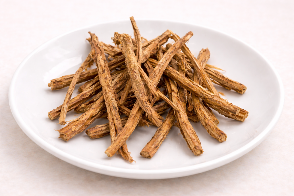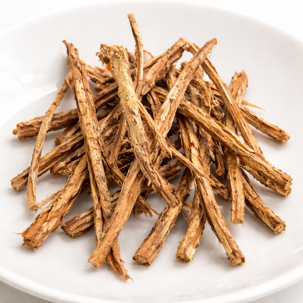 The dried root features a natural brown to dark brown tone with a characteristic woody texture, indicating proper post-harvest handling and moisture control.